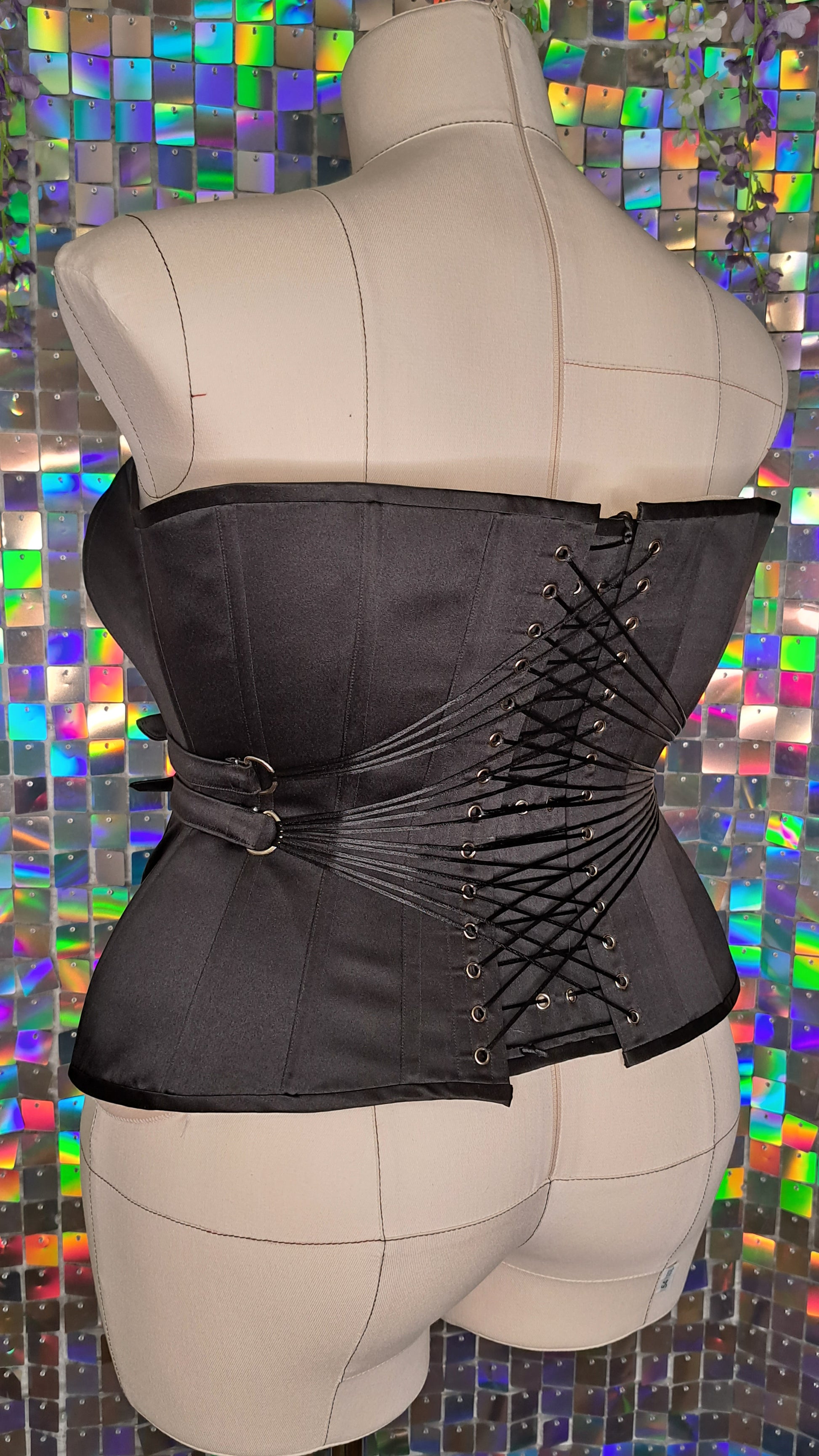 A supportive steel-boned overbust corset. Two layers, durable polyester satin on the outer layer and soft cotton on the inside. Front busk, 17 panels, exclusively steel-boned. Hand-sewn finish.